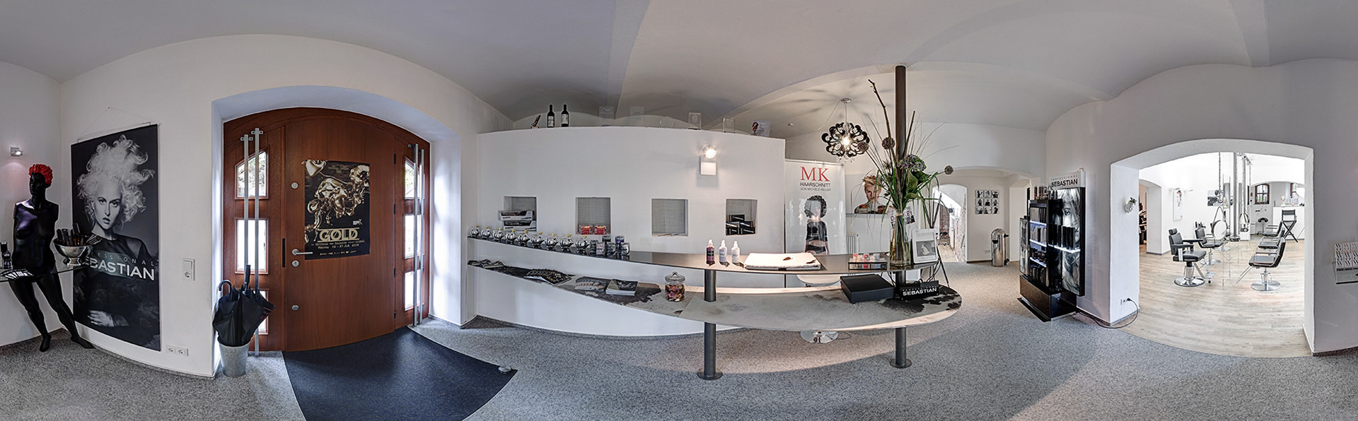 a 360° virtual tour of a hairstylists salon, MK HAARSCHNITT. based on that the strange views from above in the 2. part. and at the end, the final reference image for the next shooting